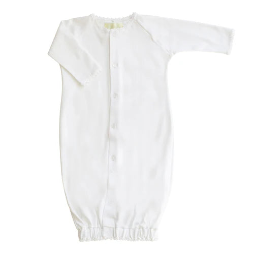 In 2000, Leda Jackson officially opened the doors of Pixie Lily proper and began creating layettes - from bonnets to blankets – for today’s babies that mirror the quality and simplicity of her own family heirlooms. This gown converts to a romper with the change of a few snaps. It has buttons down the top half of the gown and snaps at the bottom half for convenience and features signature embroidery and crochet tatting.